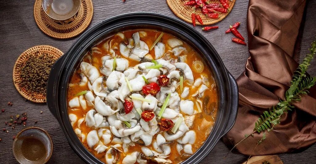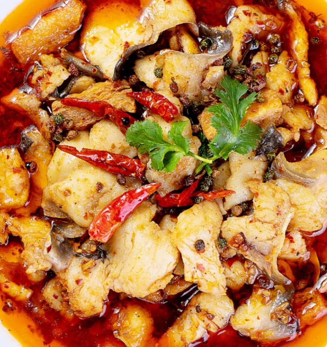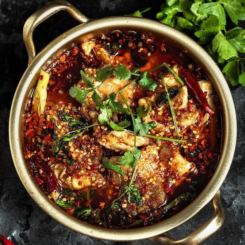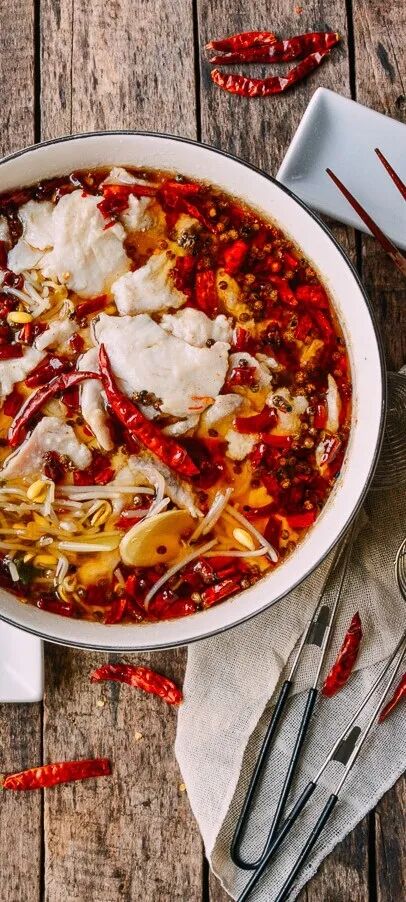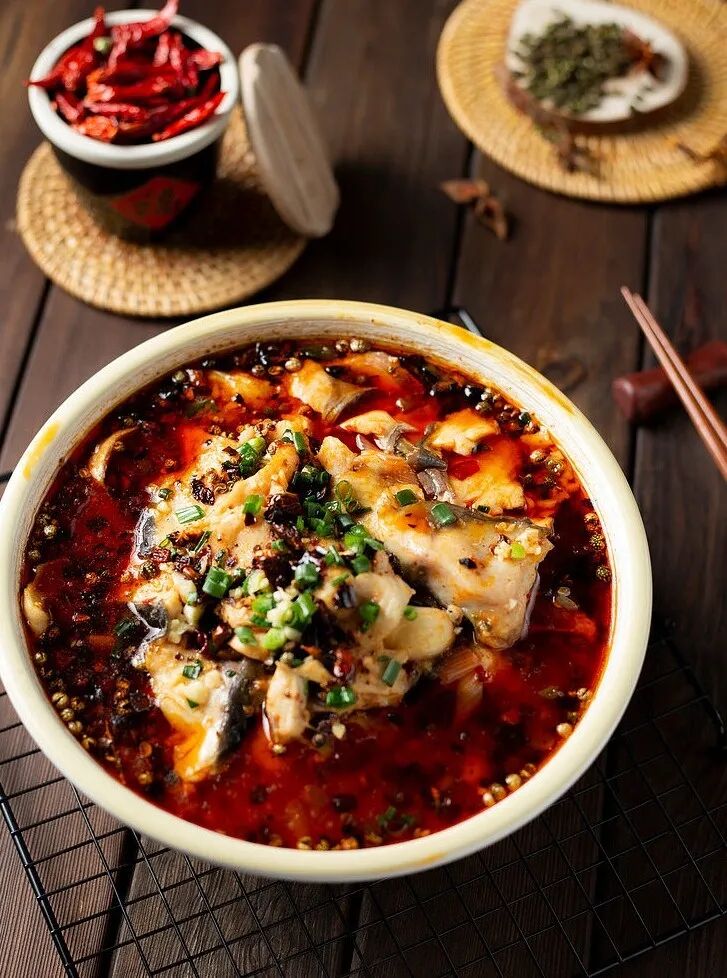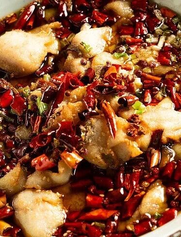 炝料包里的料放在鱼肉上,放置在一堆就可以了,不用铺开。锅中烧热油,并浇在炝料包上。这样一道美味的水煮鱼就好了。