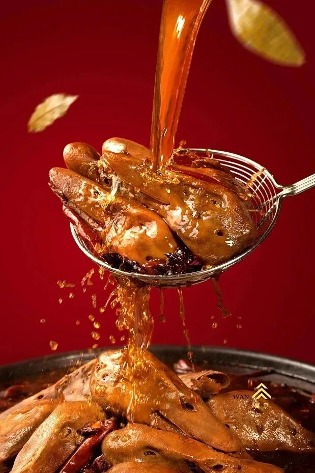 卤制,放入干料包(内含青花椒10g、红花椒20g、新一代整椒30g), 再放入8个鸭头卤制10- 20分钟即可将料包捞出。 |